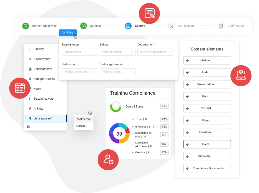 With Samelane LMS, you can replace offline courses and meetings, and thus cut external cost significantly. Automate onboarding, learning, compliance training, evaluations, and other internal processes.