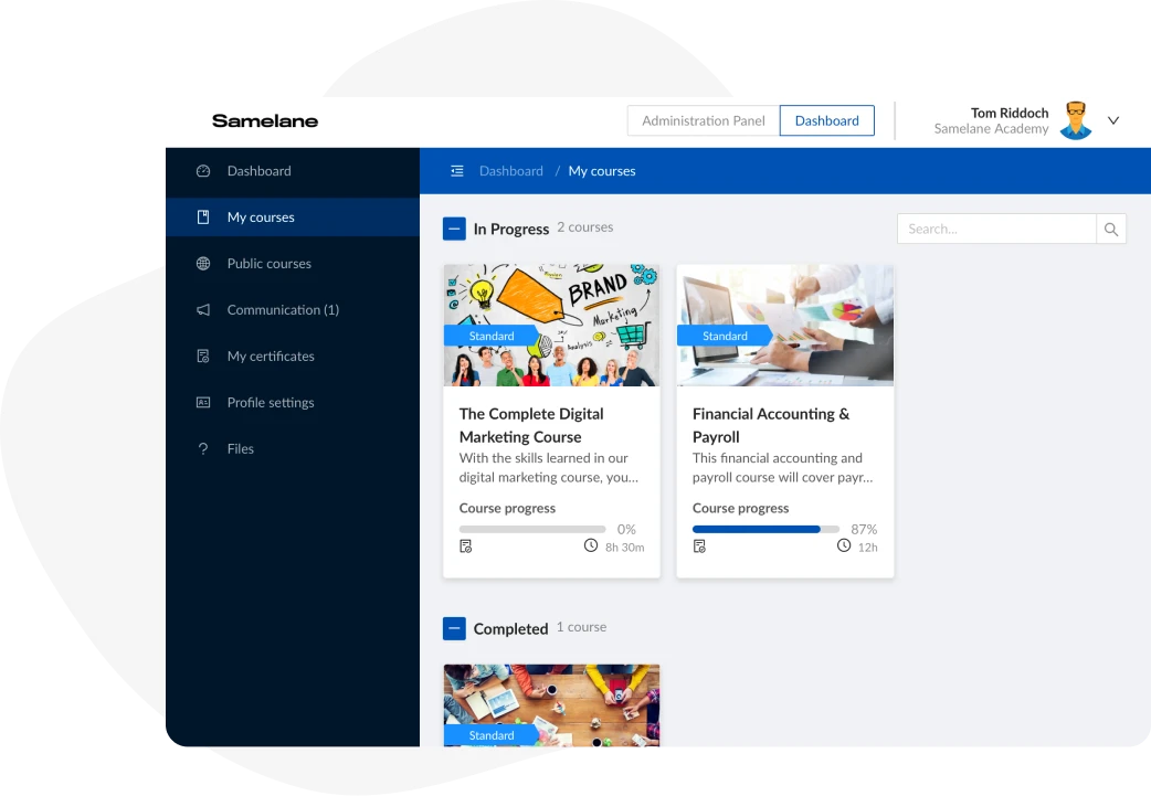 Your team members have their own dashboards uniquely designed to overview all courses (newly released, ongoing and completed).