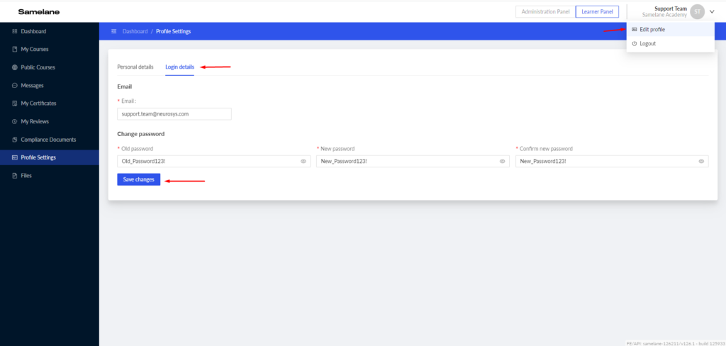 On the Settings screen, you may Change the password form where it is required to type your old (current) password and the new one. The password should be at least 8 characters long and contain at least 1 small letter, 1 capital letter, 1 number, and 1 special character.