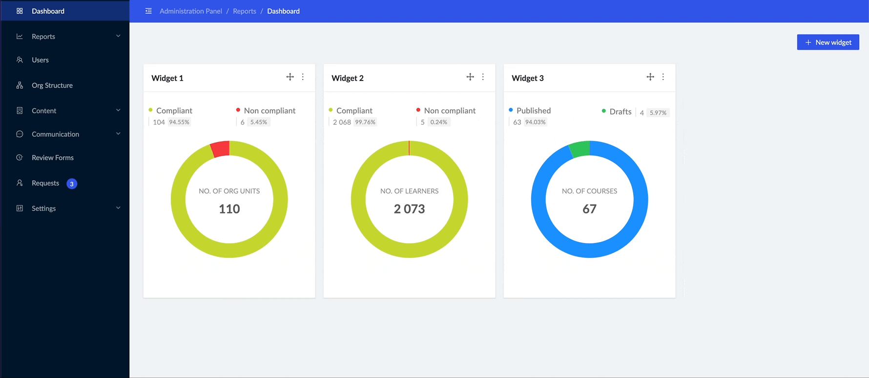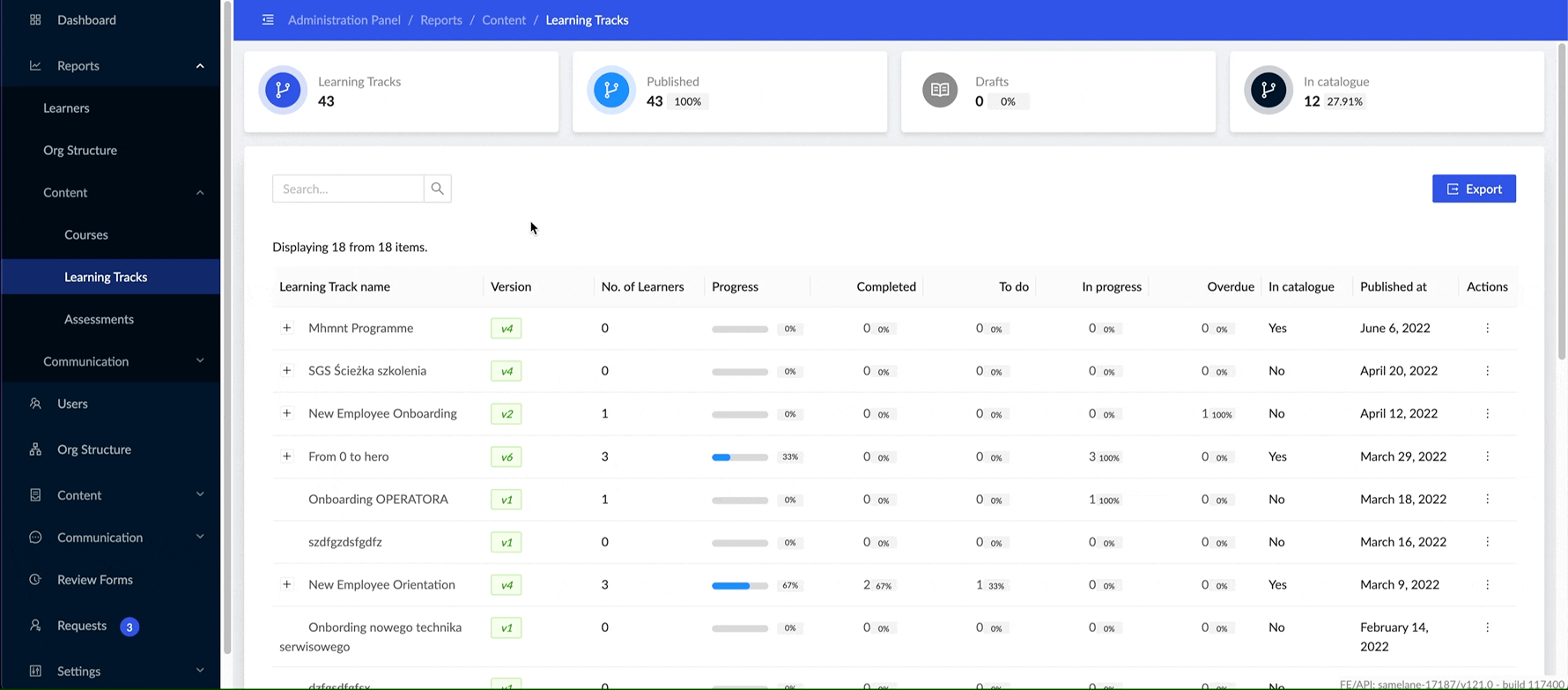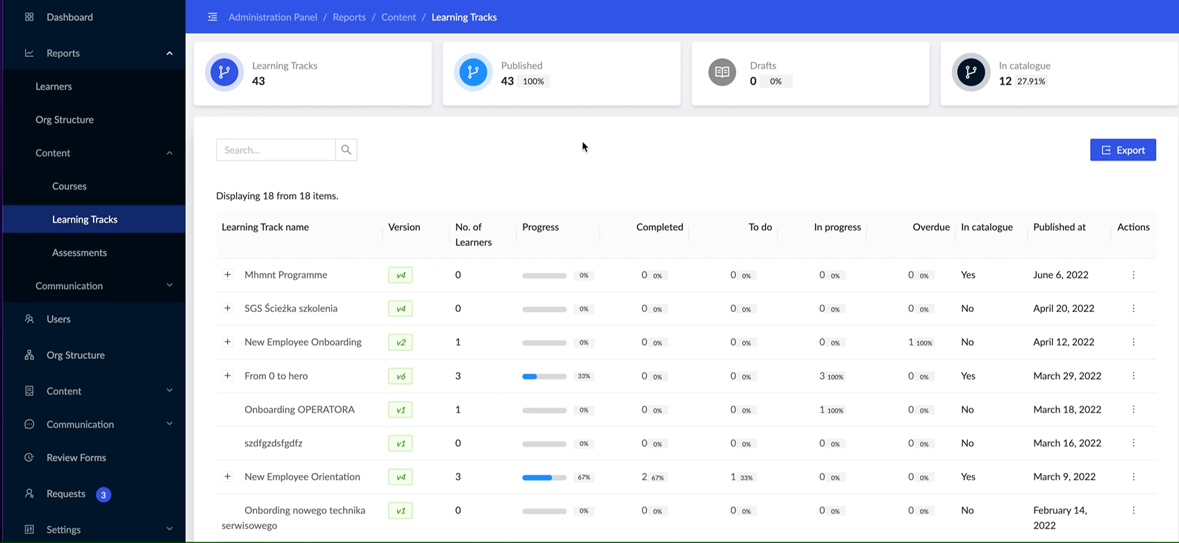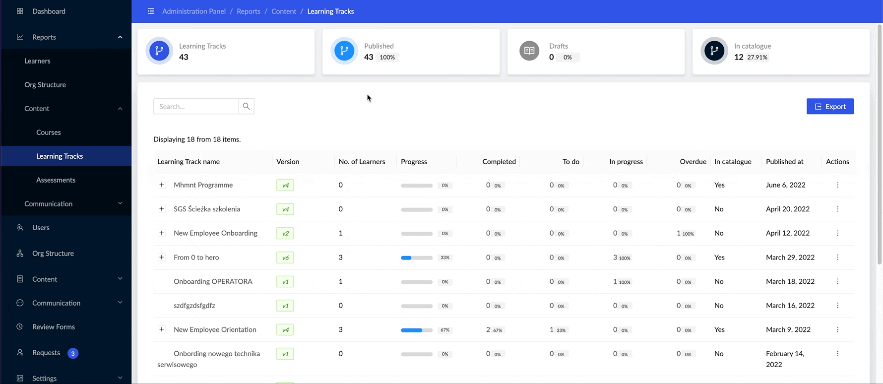 - Learning Track Courses Reports provide you with courses Completion Rate visualization within the Learning Track.