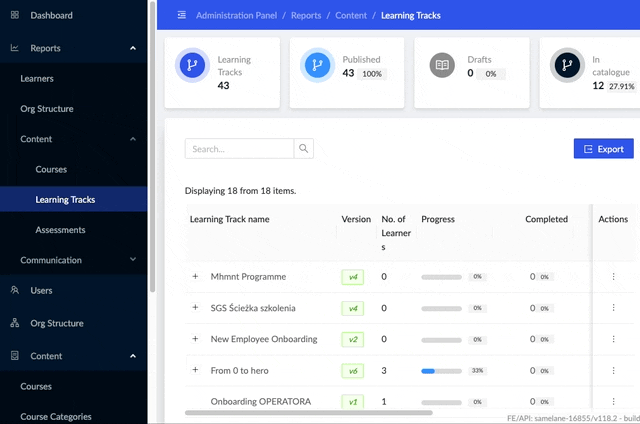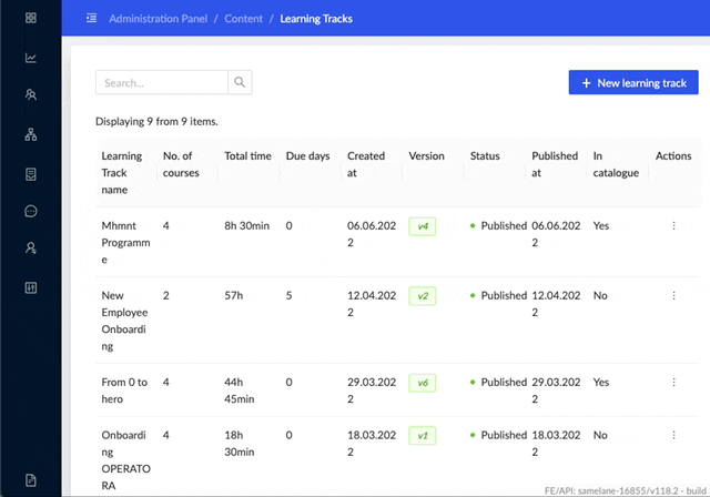Learning Tracks that you created might need an update after some time. When you decide to edit an existing Learning Track, add or remove information, a new version of Learning Track is created. This functionality gives you control over access to the new version of the Learning Track. It also allows your learners to decide if they want to go with the track’s new version. In reports you can check detailed statistics for each version.