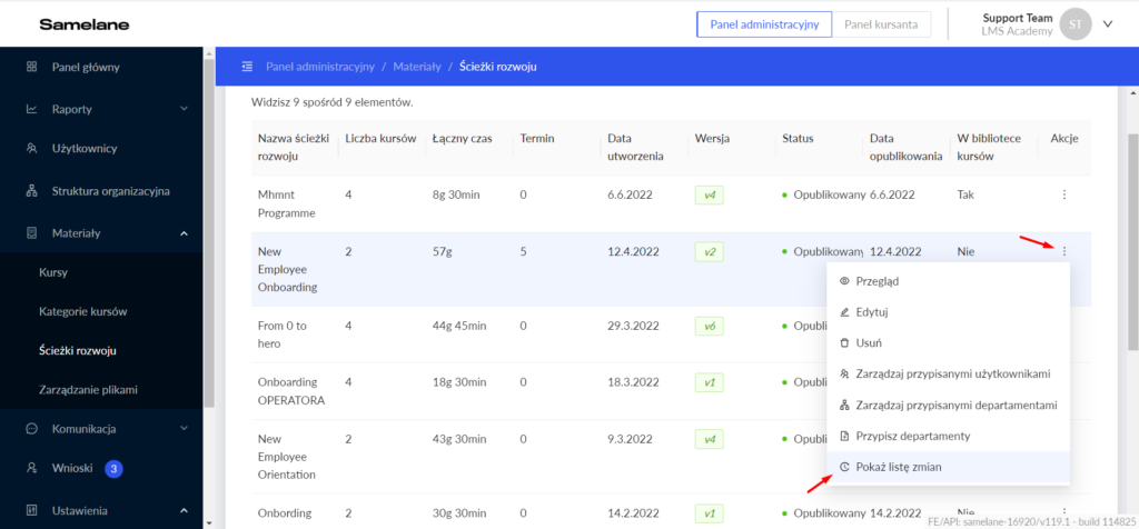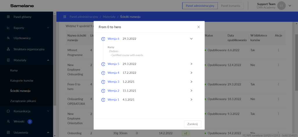 Użytkownicy z uprawnieniami administratora mogą sprawdzić listę zmian ścieżek rozwoju.
