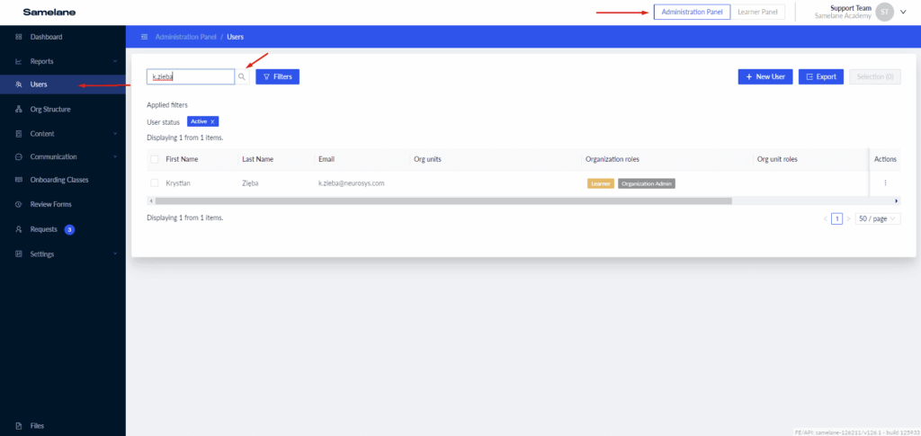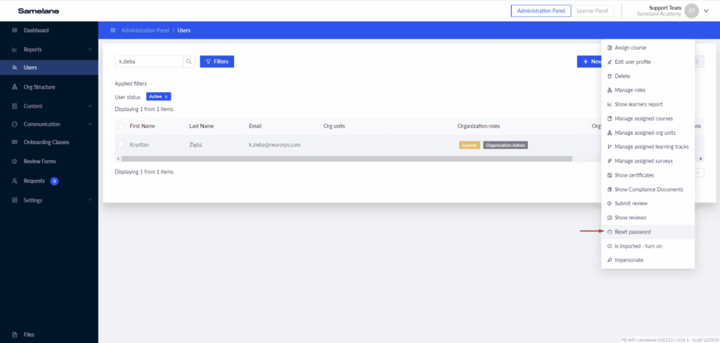 A user with administrator permissions (Organization Admin role) can reset a password for every user with a Learner or/and Organization Admin role within their organization. To do this go to the Administration Panel > Users tab and find a user you want to reset the password for. A search box may come in handy.
